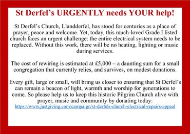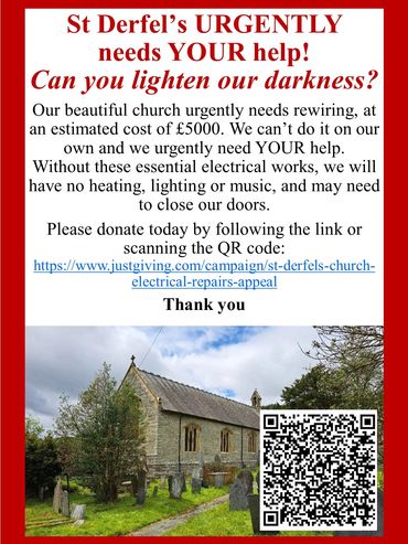 The church is open daily, from dawn to dusk. We have been accepted as a Pilgrim Church so everyone is welcome to come in and pray, light a votive candle and explore the fascinating history of the church in peace and quiet. The present church is an early Tudor rebuilding, probably of the early 16th century, and offers the most incredible space in which to enjoy a little respite from the daily stresses of life. Read all bout St Derfel's fascinating history on Church in Wales' website: Hidden-Gem-St-Derfel.pdf (dioceseofstasaph.org.uk) . Or to connect with St Derfel's Church, please visit the Facebook page.