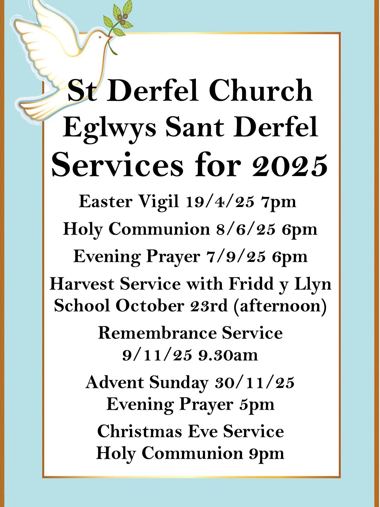 The beautiful St Derfel's Church is open daily for prayer, peace and reflection, so please do pop in. However, as we're a pilgrim church, we don't have regular Sunday or midweek services, but we do have a schedule of services which take place throughout the year, and these are advertised throughout the Mission Area.